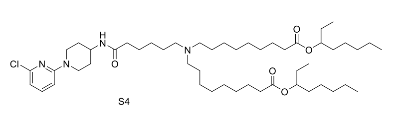 Lipid S4 is an advanced ionizable lipid engineered for systemic mRNA delivery to the brain, leveraging SR-57227—a high-affinity 5-HT3 receptor ligand—as its core head group to enable targeted blood-brain barrier (BBB) penetration via receptor-mediated transcytosis, while incorporating amino linkers for pH-responsive ionization and biodegradable branched ester tails to facilitate efficient endosomal escape and intracellular mRNA release; optimized through orthogonal screening into OS4 LNP (formulated at S4/DOPE/Chol/DMG-PEG2k = 40:40:60:0.75 molar ratio), it demonstrated a 13.3-fold increase in brain mRNA expression compared to FDA-approved MC3 LNPs, and further conjugation with the Tat cell-penetrating peptide yielded OS4T LNP, boosting delivery efficiency by 12.7-fold over OS4 alone and enabling broad mRNA expression across neurons, astrocytes, microglia, and endothelial cells; validated in orthotopic glioblastoma models, OS4T delivered engineered IL-12 mRNA, suppressing tumor growth and extending median survival to 37 days (vs. 17 days for controls) with minimal systemic toxicity, positioning S4-based LNPs as a robust, translatable platform for CNS-targeted therapeutics.