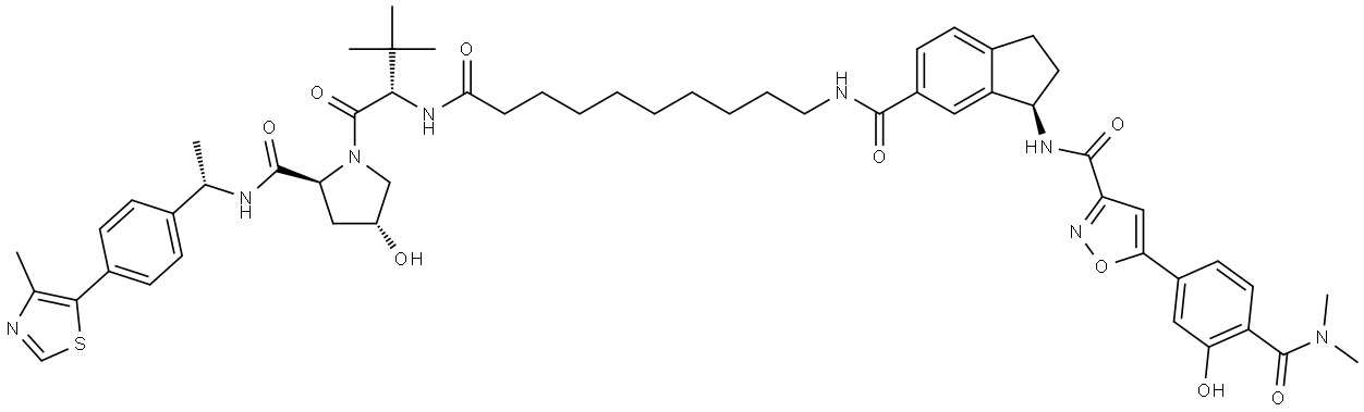 SMILES: S1C=NC(C)=C1C1C=CC(=CC=1)[C@H](C)NC([C@@H]1C[C@H](CN1C([C@H](C(C)(C)C)NC(CCCCCCCCCNC(C1C=CC2=C(C=1)[C@@H](CC2)NC(C1C=C(C2C=CC(C(N(C)C)=O)=C(C=2)O)ON=1)=O)=O)=O)=O)O)=O