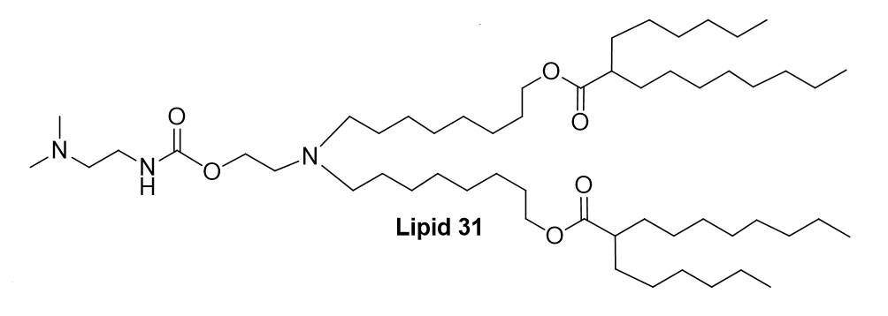 L31 is identified as a novel, proprietary ionizable cationic lipid that serves as the critical functional component within lipid nanoparticles (LNPs) engineered for CRISPR/Cas9 genome editing in head and neck squamous cell carcinoma (HNSCC). It was selected from a screened library of lipids for its superior performance. LNPs formulated with L31 exhibited excellent physicochemical properties, including a uniform size of 80-100 nm, low polydispersity, and high encapsulation efficiency (>85%) for both Cas9 mRNA and sgRNA. In vitro, L31-based LNPs demonstrated outstanding therapeutic efficacy, achieving approximately 68% gene editing of the oncogene SOX2 and an 88% reduction in cancer cell viability.For in vivo applications, L31-LNPs were further functionalized with anti-EGFR antibodies using the ASSET linker strategy to create targeted nanoparticles (tLNPs). This modification enhanced specific uptake by tumor cells. In a xenograft mouse model, intratumoral injection of these targeted L31-cLNPs co-encapsulating Cas9 mRNA and sgSOX2 led to potent tumor growth inhibition (90%) and a significant increase in survival, with tumor disappearance observed in half of the treated mice. In conclusion, L31 is a highly efficient ionizable lipid that forms the foundation of a potent targeted LNP platform for precise CRISPR-based cancer therapy against solid tumors.