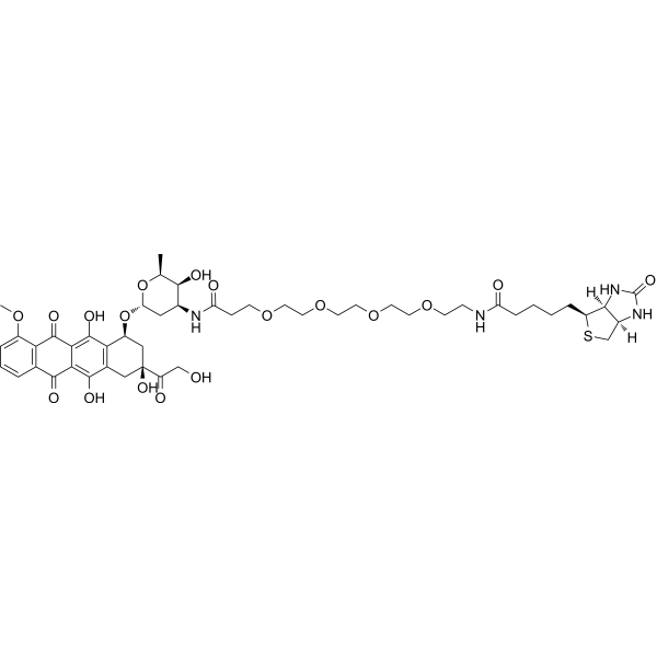 Dox-btn2 is a biotinylated derivative of Doxorubicin, with a biotin label at the point of conjugation to doxorubicin at 3'-NH2. Dox-btn2 can be used for cell imaging. While Doxorubicin is mainly accumulated in the nucleus, while Dox-btn2 is mainly located in the cytoplasm.