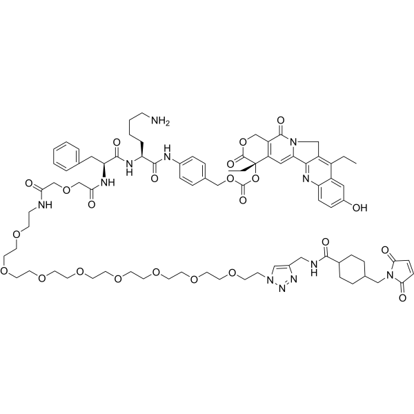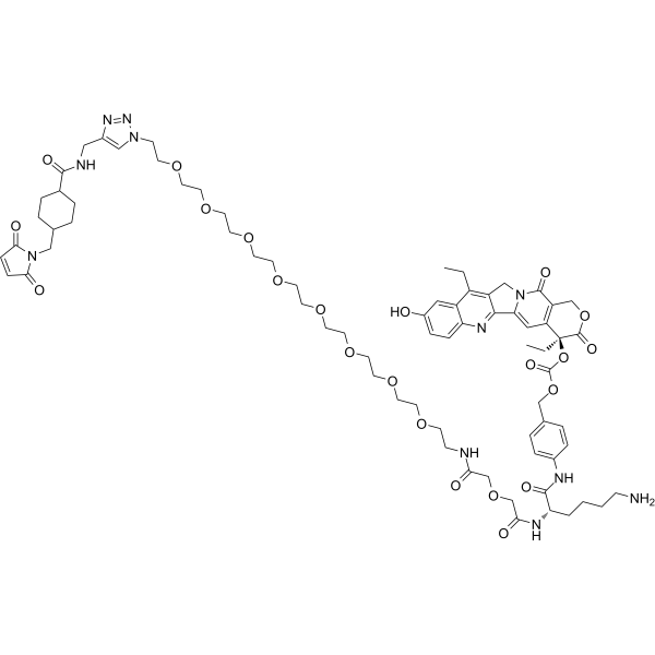 CL2A-SN38 is a SN38 derivative with a peptide-linker which can easily react with antibody to form an antibody-drug conjugate (ADC). CL2A-SN-38 is composed of a potent a DNA Topoisomerase I inhibitor SN-38 and a linker CL2A to make antibody drug conjugate (ADC). CL2A-SN-38 provides significant and specific antitumor effects against a range of human solid tumor types. CL2A is a noncleavable complicated PEG8- and triazole-containing PABC-peptide-mc linker. CL2A is cleavable through pH sensitivity, giving rise to bystander effect, and binds the antibody at a cysteine residue via a disulfide bond. .