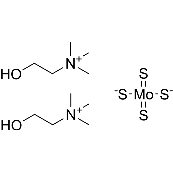 ATN-224 is a choline salt of tetrathiomolybdate and an inhibitor of superoxide dismutase 1 (SOD1; IC50s = 2.91 and 3.51 µM in human and mouse blood cells, respectively, in vitro).