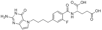 AGF347 (AGF-347) is a small molecule inhibitor targeting mitochondrial C1 metabolism at SHMT2 (in vitro Ki=2.19 uM), also directly targers the purine biosynthetic enzymes GARFTase (Ki=3.13 uM) and AICARFTase (Ki=3.72 uM), and SHMT1 (Ki=2.91 uM).