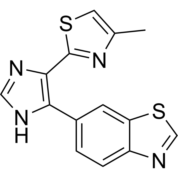 TP0427736 is a highly selective inhibitor of ALK5, demonstrating potent activity with an IC50 of 2.72 nM. It effectively suppresses Smad2/3 phosphorylation in A549 cells, highlighting its ability to modulate TGF-β signaling pathways. Additionally, TP0427736 has been shown to reduce the growth inhibition of human outer root sheath cells, suggesting its potential therapeutic utility in conditions where ALK5-mediated signaling plays a critical role. This compound represents a promising tool for investigating ALK5-related biological processes and developing targeted treatments for diseases involving aberrant TGF-β signaling.