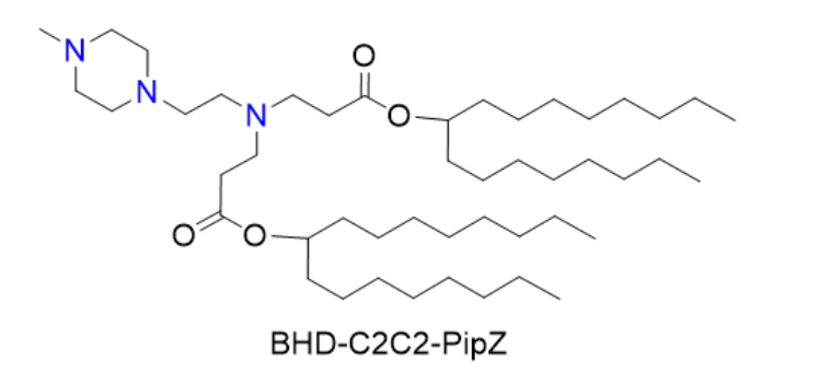 BHD-C2C2-PipZ, as an efficient ionizable cationic lipid, achieves high encapsulation efficiency and controllable release of mRNA through its unique chemical structure. In PEG-free 3P-LNPs, its electrostatic interaction with tripolyphosphate successfully replaces the steric stabilization effect of traditional PEG, offering a new strategy to circumvent PEG immunogenicity. Its hepatic distribution pattern further indicates that LNP design should take into account the heterogeneity of the organ microenvironment.