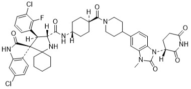 KT-253 is a potent small molecule that stabilizes p53 while simultaneously acting as a PROTAC to degrade MDM2 (DC50 = 0.4 nM). It demonstrates strong antiproliferative effects in RS4;11 leukemia cells (IC50 = 0.3 nM), inducing G2/M cell cycle arrest and apoptosis. In vivo studies confirm its antitumor activity in mouse models.