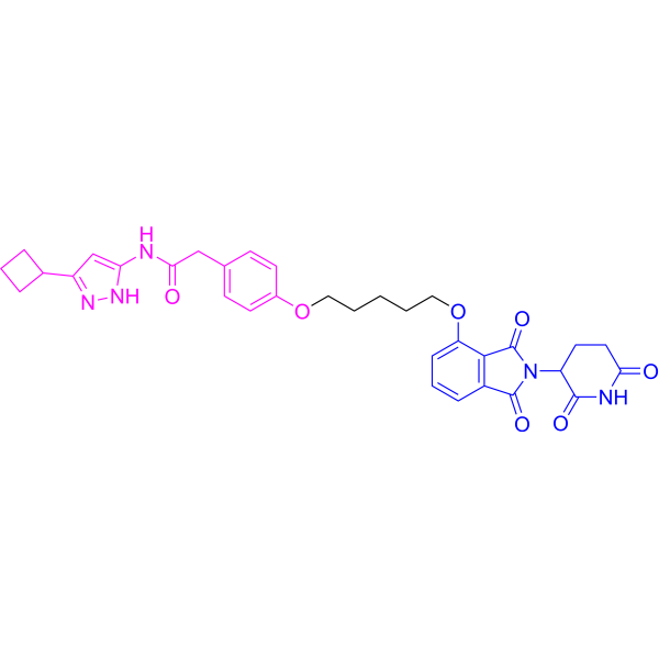 YX-2-107 is a CRBN-recruiting and specific CDK6-degrading PROTAC with IC50 of 0.69 and 4.4 nM for CDK4 and CDK6 in vitro, selectively degardes CDK6 in Ph+ BV173 ALL cells with a degradation constant of 4 nM.YX-2-107 does not affect expression of IKZF1 and IKZF3, and does not degarde CDK4 protein.YX-2-107 inhibits S-phase entry, cell proliferation, RB phosphorylation, and FOXM1 expression and induces the selective degradation of CDK6 in Ph+ BV173 and SUP-B15 cells.|PROTAC YX-2-107 is bioavailable in mice and pharmacologically active in suppressing Ph+ ALL proliferation in a mouse xenograft of Ph+ ALL, comparable or superior to that of the CDK4/6 enzymatic inhibitor palbociclib.