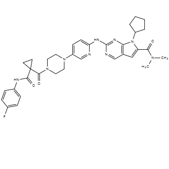 SMILES: C1(NC2=NC=C(N3CCN(C(C4(C(NC5=CC=C(F)C=C5)=O)CC4)=O)CC3)C=C2)=NC=C2C=C(C(N(C)C)=O)N(C3CCCC3)C2=N1