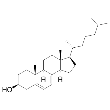 Description: | In Vitro 7-Dehydrocholesterol is a biosynthetic precursor of cholesterol and vitamin D3. 7-Dehydrocholesterol is present in relatively high concentration in skin where it is converted to pre-vitamin D3 upon UV irradiation and where it is also exposed to exogenous radical sources and oxygen. |