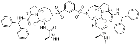 SMILES: | O=C(NC(C1=CC=CC=C1)C2=CC=CC=C2)[C@@H]3CC[C@H](CCN(S(C4=CC=CC(S(N(C[C@@H]5NC([C@H](C)NC)=O)CC[C@@H]6N([C@H](C(NC(C7=CC=CC=C7)C8=CC=CC=C8)=O)CC6)C5=O)(=O)=O)=C4)(=O)=O)C[C@@H]9NC([C@@H](NC)C)=O)N3C9=O |