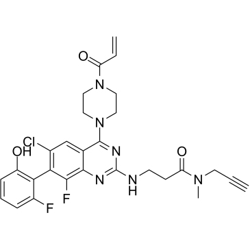 SMILES: | O=C(N1CCN(C2C3C(=C(C(=C(C=3)Cl)C3C(F)=CC=CC=3O)F)N=C(NCCC(=O)N(CC#C)C)N=2)CC1)C=C |