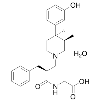 Description: | Alvimopan(LY 246736; ADL 8-2698) is a peripherally acting mu-opioid receptor (PAM-OR, IC50= 1.7 nM) antagonist for accelerating gastrointestinal recovery after surgery. in vitro: The dissociation rate of alvimopan from the micro opioid receptor (t(1/2)=30--44 min) was comparable to that of the long acting partial agonist buprenorphine (t(1/2)=44 min), but was slower than those of the antagonists naloxone (t(1/2)=0.82 min) and N-methylnaltrexone (t(1/2)=0.46 min). in vivo: Alvimopan did not significantly accelerate GI-3 compared with placebo [6 mg: hazard ratio (HR) = 1.20, p = 0.080; 12 mg: HR = 1.24, p = 0.038). However, after adjustment for significant covariates (sex/surgical duration), benefits were significant for both doses (6 mg: HR = 1.24, p = 0.037; 12 mg: HR = 1.26, p = 0.028). Alvimopan also significantly accelerated time to GI-2 (6 mg: HR = 1.37, p = 0.008; 12 mg: HR = 1.33, p = 0.018) and DCO (6 mg: HR = 1.31, p = 0.008; 12 mg: HR = 1.28, p = 0.015) . Alvimopan (1 and 3 mg/kg) significantly reversed this delayed GI transit when administered 45 min prior to surgery. However, the effects of alvimopan were less pronounced when administered following surgery. |