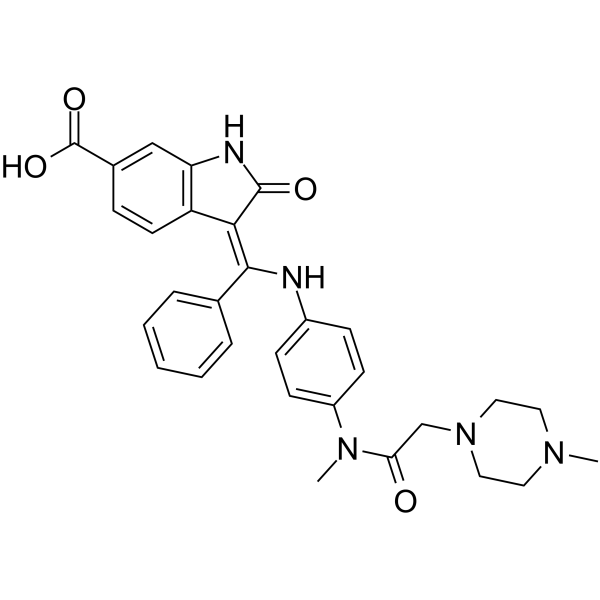 SMILES: | C(/C1C=CC=CC=1)(=C1\C(=O)NC2C=C(C=CC\1=2)C(=O)O)\NC1C=CC(N(C)C(=O)CN2CCN(C)CC2)=CC=1 |