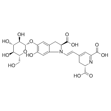 Description: | In Vitro Betanin is a representative constituent of red beetroot betacyanins, could inhibit peroxynitrite (ONOO-), with an IC50 of 19.2 μM. Betanin also has anti-inflammatory, anti-proliferative effects, nephroprotective activity, cardioprotective activity, strong, antioxidant and angiotensin converting enzyme (ACE) inhibitory activity. Another study is also indicated the protective effect of Betanin against high glucose induced rat renal epithelial cell fibrosis and matrix accumulation, major features of diabetic nephropathy (DN). In Vivo Betanin can inhibit the fructose-induced diabetic cardiac fibrosis and paraquat induced acute kidney toxicity. The co-administration of Betanin (20 mg/kg b.w.) to diabetic rats prevent significantly the raise of glucose level and also reverse the levels of insulin compared with untreated diabetic rats. Interestingly diabetic rats treated with Betanin (20 mg/kg b.w.) and glibenclamide portray the significant changes in the body weight compared to diabetic control. HbA1c levels significantly increases in diabetic rats and when treated with Betanin as well as glibenclamide. Treatment with Betanin as well as glibenlamide to STZ-NA induces diabetic rat’s elicit significant decreases in those levels when compared with diabetic control rats. |