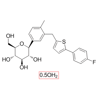 SMILES: | CC1=CC=C([C@H]2[C@H](O)[C@@H](O)[C@H](O)[C@@H](CO)O2)C=C1CC3=CC=C(C4=CC=C(F)C=C4)S3.[0.5OH2] |