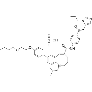 SMILES: | CCCCOCCOC1=CC=C(C=C1)C2=CC/3=C(C=C2)N(CCC/C(=C3)/C(=O)NC4=CC=C(C=C4)[S@@](=O)CC5=CN=CN5CCC)CC(C)C.CS(=O)(=O)O |