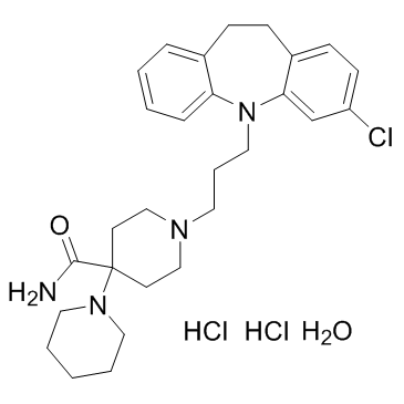 SMILES: | O=C(C1(N2CCCCC2)CCN(CCCN3C4=CC(Cl)=CC=C4CCC5=CC=CC=C53)CC1)N.Cl.O.Cl |