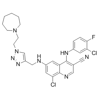 Synonyms: | 3-Quinolinecarbonitrile, 8-chloro-4-[(3-chloro-4-fluorophenyl)amino]-6-[[[1-[2-(hexahydro-1H-azepin-1-yl)ethyl]-1H-1,2,3-triazol-4-yl]methyl]amino]- |