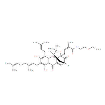 Chemical Name: | (Z)-4-((1S,3aR,5S,12aS)-9-((E)-3,7-dimethylocta-2,6-dien-1-yl)-8,10-dihydroxy-2,2-dimethyl-11-(3-methylbut-2-en-1-yl)-4,7-dioxo-1,2,5,7-tetrahydro-1,5-methanofuro[2,3-d]xanthen-3a(4H)-yl)-N-(2-ethoxyethyl)-2-methylbut-2-enamide |