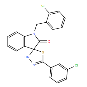 SMILES: | N(CC1=CC=CC=C1Cl)1C2=C(C=CC=C2)C2(NN=C(C3=CC=CC(Cl)=C3)S2)C1=O |