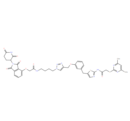 SMILES: | C(NC1=NC=C(CC2=CC=CC(OCC3=CN(CCCCNC(=O)COC4=CC=CC5=C4C(=O)N(C4CCC(=O)NC4=O)C5=O)N=N3)=C2)S1)(=O)CSC1=NC(C)=CC(C)=N1 |