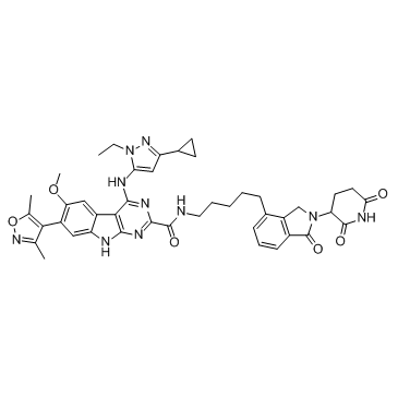 Chemical Name: | 4-((3-cyclopropyl-1-ethyl-1H-pyrazol-5-yl)amino)-7-(3,5-dimethylisoxazol-4-yl)-N-(5-(2-(2,6-dioxopiperidin-3-yl)-1-oxoisoindolin-4-yl)pentyl)-6-methoxy-9H-pyrimido[4,5-b]indole-2-carboxamide |