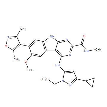 Chemical Name: | 4-((3-cyclopropyl-1-ethyl-1H-pyrazol-5-yl)amino)-7-(3,5-dimethylisoxazol-4-yl)-6-methoxy-N-methyl-9H-pyrimido[4,5-b]indole-2-carboxamide |