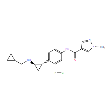 SMILES: | N(C)1C=C(C(NC2=CC=C([C@H]3C[C@@H]3NCC3CC3)C=C2)=O)C=N1.[H]Cl |