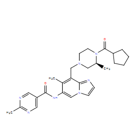 Chemical Name: | (S)-N-(8-((4-(cyclopentanecarbonyl)-3-methylpiperazin-1-yl)methyl)-7-methylimidazo[1,2-a]pyridin-6-yl)-2-methylpyrimidine-5-carboxamide |