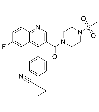 SMILES: | CS(=O)(=O)N1CCN(CC1)C(=O)C2=CN=C3C=CC(=CC3=C2C4=CC=C(C=C4)C5(CC5)C#N)F |