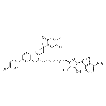 SMILES: [C@H]1([C@H](O)[C@@H](CSCCCCN(CC2=CC(C3C=CC(Cl)=CC=3)=CC=C2)C(CC(C)(C)C2C(=O)C(C)=C(C)C(C=2C)=O)=O)O[C@H]1N1C=NC2C(N)=NC=NC=21)O