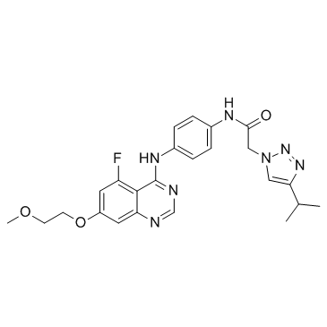 SMILES: | CC(C)C1=CN(N=N1)CC(=O)NC2=CC=C(C=C2)NC3=NC=NC4=C3C(=CC(=C4)OCCOC)F |