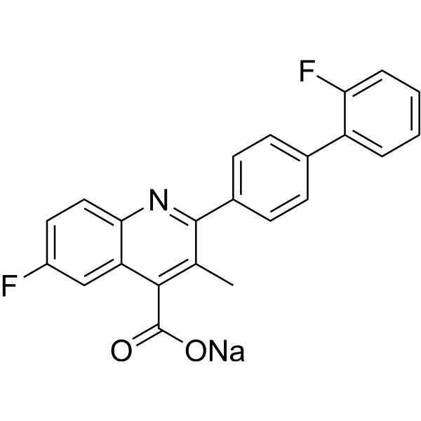 Description: | Brequinar sodium (DuP-785, Brequinar, NSC 368390) is a potent and selective inhibitor of DHODH with IC50 of 20 nM, triggers differentiation in the ER-HoxA9, U937, and THP1 cells with an ED50 of 1 uM; arrests tumor growth in HL60 and MOLM13 subcutaneous xenograft models of AML in NOD SCID mice. |