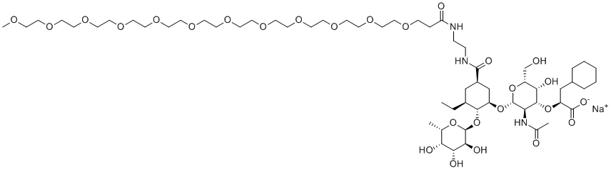 Chemical Name: | Sodium (1R,2R,3S,5R)-2-[(6-deoxy-α-L-galactopyranosyl)oxy]-3-ethyl-5-[(38-oxo-2,5,8,11,14,17,20,23,26,29,32,35-dodecaoxa-39-azahentetracontan-41-yl)carbamoyl]cyclohexyl 2-acetamido-3-O-[(1S)-1-car boxylato-2-cyclohexylethyl]-2-deoxy-β-D-galactopyranoside |