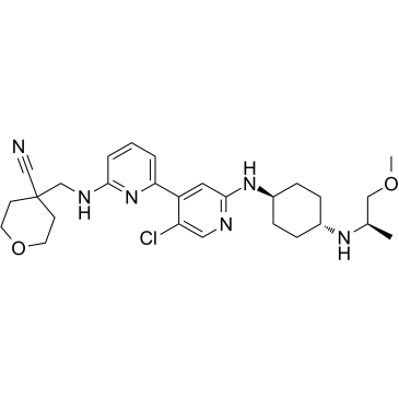 SMILES: | C[C@H](COC)NC1CCC(CC1)NC2=NC=C(C(=C2)C3=NC(=CC=C3)NCC4(CCOCC4)C#N)Cl |