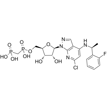 Synonyms: | J6K8WSV73A;GTPL10707;AB680;[[(2R,3S,4R,5R)-5-[6-chloro-4-[[(1S)-1-(2-fluorophenyl)ethyl]amino]pyrazolo[3,4-b]pyridin-1-yl]-3,4-dihydroxyoxolan-2-yl]methoxy-hydroxyphosphoryl]methylphosphonic acid;(((((2R,3S,4R,5R)-5-(6-chloro-4-(((S)-1-(2-fluorophenyl)ethyl)amino)-1H-pyrazolo[3,4-b]pyridin-1-yl)-3,4-dihydroxytetrahydrofuran-2-yl)methoxy)(hydroxy)phosphoryl)methyl)phosphonic acid;CID 130205852 AB 680 |