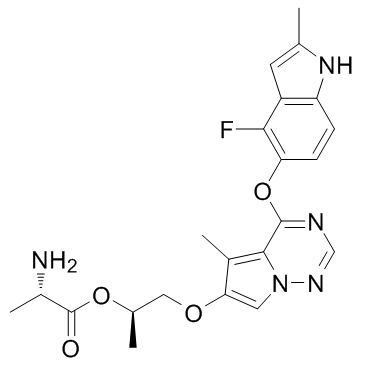 Chemical Name: | (S)-(R)-1-((4-((4-fluoro-2-methyl-1H-indol-5-yl)oxy)-5-methylpyrrolo[2,1-f][1,2,4]triazin-6-yl)oxy)propan-2-yl 2-aminopropanoate |
