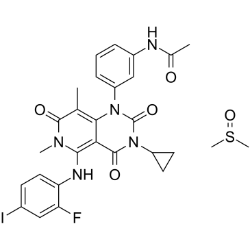 Description: | Trametinib DMSO solvate is a potent MEK inhibitor that specifically inhibits MEK1/2, with an IC50 value of about 2 nM. |
