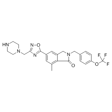SMILES: | CC1=CC(=CC2=C1C(=O)N(C2)CC3=CC=C(C=C3)OC(F)(F)F)C4=NC(=NO4)CN5CCNCC5 |