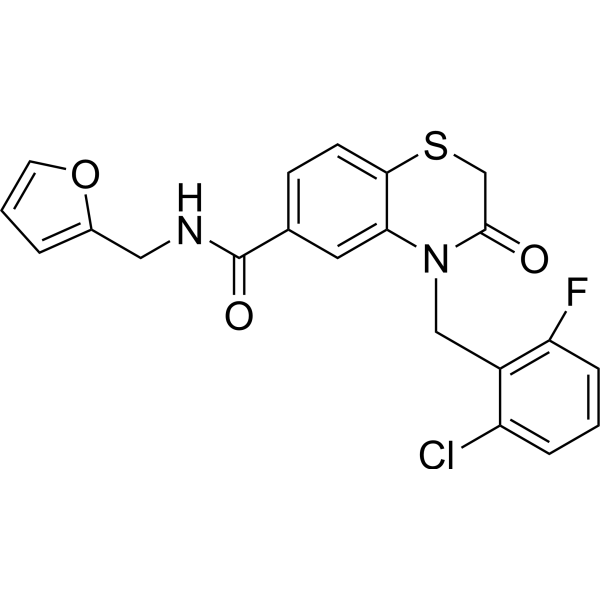 Synonyms: | STING agonist-1;G10;G10 [PMID: 26646986];4-(2-chloro-6-fluorobenzyl)-N-(furan-2-ylmethyl)-3-oxo-3,4-dihydro-2H-benzo[b][1,4]thiazine-6-carboxamide;GTPL9206;HMS1621G10;BCP33022;s8954;4-[(2-chloro-6-fluorophenyl)methyl]-N-(furan-2-ylmethyl)-3-oxo-1,4-benzothiazine-6-carboxamide;Q27077760;4-[(2-Chloro-6-fluorophenyl;CDB66250;D83678;A918021 |