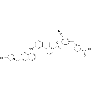 SMILES: | C(O)([C@H]1CN(CC2=CC3N=C(C4C=CC=C(C=4C)C4=C(C(NC5=C6N=CC(CN7CC[C@@H](O)C7)=CC6=CC=N5)=CC=C4)C)OC=3C(C#N)=C2)CC1)=O |