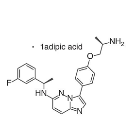 SMILES: | O=C(O)CCCCC(O)=O.C[C@@H](NC1=NN2C(C=C1)=NC=C2C3=CC=C(OC[C@H](N)C)C=C3)C4=CC=CC(F)=C4 |
