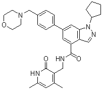 Synonyms: | EPZ005687;1-cyclopentyl-N-[(4,6-dimethyl-2-oxo-1H-pyridin-3-yl)methyl]-6-[4-(morpholin-4-ylmethyl)phenyl]indazole-4-carboxamide;1H-Indazole-4-carboxamide, 1-cyclopentyl-N-[(1,2-dihydro-4,6-dimethyl-2-oxo-3-pyridinyl)methyl]-6-[4-(4-morpholinylmethyl)phenyl]-;1-cyclopentyl-N-((4,6-dimethyl-2-oxo-1,2-dihydropyridin-3-yl)methyl)-6-(4-(morpholinomethyl)phenyl)-1H-indazole-4-carboxamide;CS-1215;EPZ-005687;EPZ 005687;ZOIBZSZLMJDVDQ-UHFFFAOYSA-N;GQ4LD5KG1E;GTPL8387;AOB1761;C32H37N5O3;BCP07899;s7004;2398AH;SB1905 |