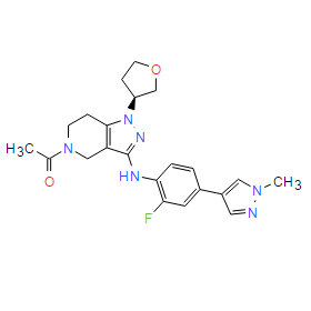 SMILES: | CC(N1CCC2=C(C(NC3=C(F)C=C(C4=CN(C)N=C4)C=C3)=NN2[C@H]5CCOC5)C1)=O |