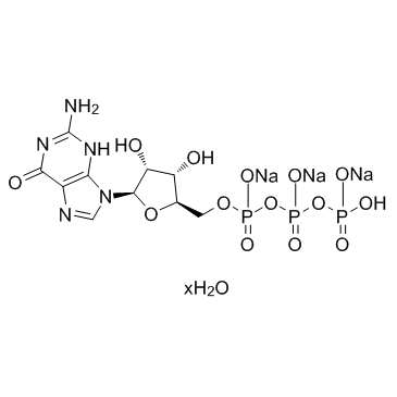 SMILES: | O[C@@H]([C@H]([C@H](N1C=NC2=C1NC(N)=NC2=O)O3)O)[C@H]3COP(OP(OP(O)(O[Na])=O)(O[Na])=O)(O[Na])=O.[xH2O] |