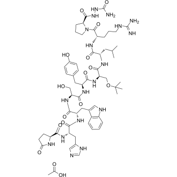 SMILES: | CC(C)C[C@@H](C(=O)N[C@@H](CCCN=C(N)N)C(=O)N1CCC[C@H]1C(=O)NNC(=O)N)NC(=O)[C@@H](COC(C)(C)C)NC(=O)[C@H](CC2=CC=C(C=C2)O)NC(=O)[C@H](CO)NC(=O)[C@H](CC3=CNC4=CC=CC=C43)NC(=O)[C@H](CC5=CN=CN5)NC(=O)[C@@H]6CCC(=O)N6.CC(=O)O |