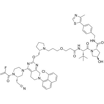 SMILES: | O=C(NCC1=CC=C(C=C1)C2=C(N=CS2)C)[C@H]3N(C[C@@H](C3)O)C([C@H](C(C)(C)C)NC(CCOCCCN4[C@@H](CCC4)COC5=NC(N6C[C@@H](N(CC6)C(C(F)=C)=O)CC#N)=C7C(CN(CC7)C8=C9C(Cl)=CC=CC9=CC=C8)=N5)=O)=O |