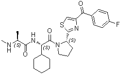 Synonyms: | LCL161;LCL-161;N-[(1S)-1-Cyclohexyl-2-{(2S)-2-[4-(4-fluorobenzoyl)-1,3-thiazol-2-yl]-1-pyrrolidinyl}-2-oxoethyl]-N2-methylalaninamide;(S)-N'-(1H-benzimidazol-2-ylmethyl)-N'-(5,6,7,8-tetrahydroquinolin-8-yl)butane-1,4-diamine;(S)-N'-(1H-benzimidazol-2-ylmethyl)-N'-(5,6,7,8-tetrahydro-quinolin-8-yl)-butane-1,4-diamine;(S)-N1-((1H-Benzo[d]imidazol-2-yl)methyl)-N1-(5,6,7,8-tetrahydroquinolin-8-yl)butane-1,4-diamine;AMD 070;AMD11070;N'-(1H-benzimidazol-2-ylmethyl)-N'-(S)-5,6,7,8-tetrahydro-quinolin-8-yl-butane-1,4-diamine;S14-0353;(2S)-N-[(1S)-1-Cyclohexyl-2-[(2S)-2-[4-(4-fluorobenzoyl)-2-thiazolyl]-1-pyrrolidinyl]-2-oxoethyl]-2-(methylamino)-propanamide;(S)-N-((S)-1-Cyclohexyl-2-((S)-2-(4-(4-fluorobenzoyl)thiazol-2-yl)pyrrolidin-1-yl)-2-oxoethyl);N-[(1S)-1-cyclohexyl-2-[(2S)-2-[4-(4-fluorobenzoyl)-2-thiazolyl]-1-pyrrolidinyl]-2-oxoethyl]-2-(methylamino)-(2S)-propanamide;(2S)-N-[(1S)-1-Cyclohexyl-2-[(2S)-2-[4-(4-fluorobenzoyl)-2-thiazolyl]-1-pyrrolidinyl]-2-oxoethyl]-2-(methylamino)-propanamide LCL 161;LCL 161;6TNS415Y3P;(s)-n-((s)-1-cyclohexyl-2-((s)-2-(4-(4-fluorobenzoyl)thiazol-2-yl)pyrrolidin-1-yl)-2-oxoethyl)-2-(methylamino)propanamide;(2S)-N-[(1S)-1-cyclohexyl-2-[(2S)-2-[4-(4-fluorobenzoyl)-1,3-thiazol-2-yl]pyrrolidin-1-yl]-2-oxoethyl]-2-(methylamino)propanamide;Propanamide, N-[(1S)-1-cyclohexyl-2-[(2S)-2-[4-(4-fluorobenzoyl)-2-thiazolyl]-1-pyrrolidinyl]-2-oxoethyl]-2-(methylamino)-, (2S)-;Propanamide, N-[(1S)-1-cyclohexyl-2-[(2S) |