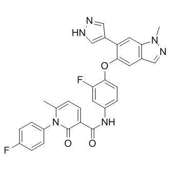 SMILES: | FC1=C(OC2=C(C3=CNN=C3)C=C3C(C=NN3C)=C2)C=CC(NC(C2=CC=C(C)N(C3C=CC(F)=CC=3)C2=O)=O)=C1 |