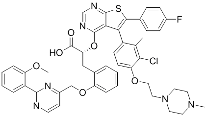 Chemical Name: | (R)-2-((5-(3-chloro-2-methyl-4-(2-(4-methylpiperazin-1-yl)ethoxy)phenyl)-6-(4-fluorophenyl)thieno[2,3-d]pyrimidin-4-yl)oxy)-3-(2-((2-(2-methoxyphenyl)pyrimidin-4-yl)methoxy)phenyl)propanoic acid |